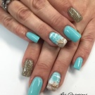 - Bright and catchy manicure looks both festive and romantic at the same time. And, of course, very marine. And this is achieved through a winning combination of blue, white and gold. The highlight of this design can be considered a decoration in the form of a golden anchor and shell. Success at a party with such a manicure is ensured.