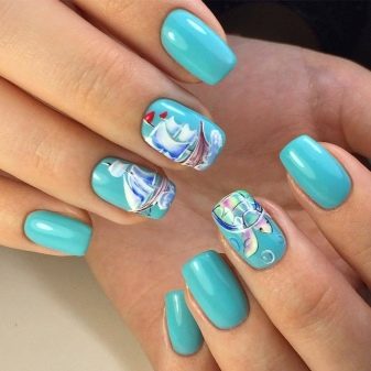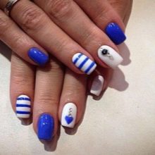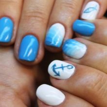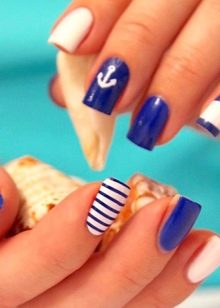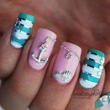 - The marine mood will create a manicure in blue and blue tones with the image of a helm and an anchor chain and stripes without difficulty. Despite the abundance of drawings, the design looks very organic due to correctly selected colors and clear low-key drawings. Based on this idea, you can come up with several options.