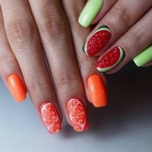But the multifaceted sea, which changes color depending on the weather, can also be reflected at your fingertips. And for this, soft blue, and dark blue, and turquoise in different shades are suitable. Bright manicure is also suitable for the sea and summer. Juicy combinations will always look bright and original: red, yellow, orange, blue, green.