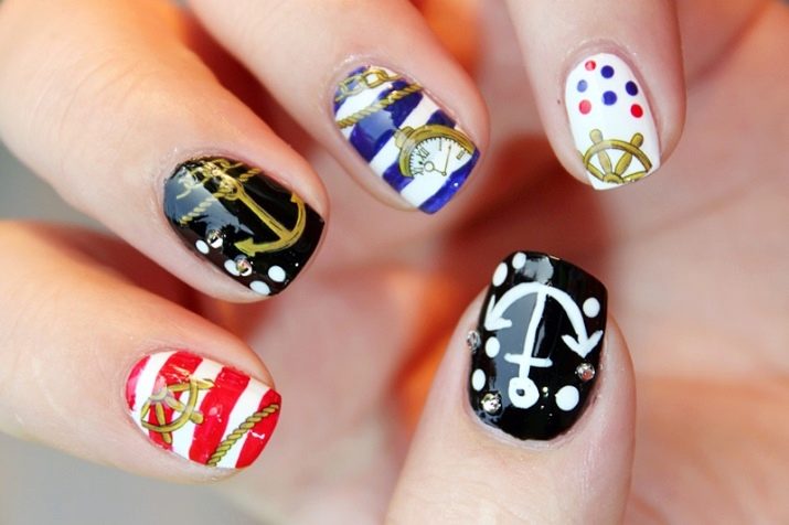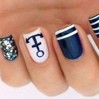 On the other hand, in such a manicure it’s enough to take into service one element and based on it create your own version. The black-and-white version with an anchor and blue-red with a helm will look equally good.