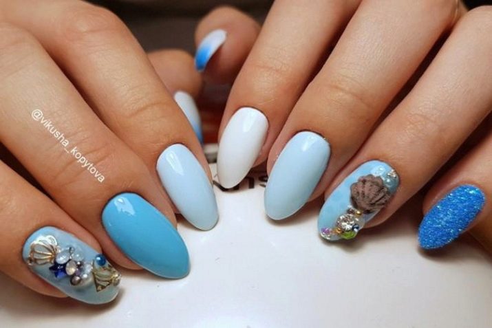 A manicure designed for the sea can be of two types: include bright summer colors, creating a mood, or focus on a marine theme, and then color combinations will include all shades close to the sea. A manicure allows for combinations of all colors of the rainbow, where a skillful master will harmoniously combine red with yellow, orange with blue, green with lilac, and this will not look like a riot of colors, but stylish and beautiful.