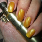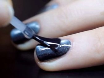 - The next step is to coat the selected varnish. Before applying, shake the composition a little so that the metal microparticles that have settled on the bottom of the bottle are distributed throughout the product. Painting can be performed in one or two layers. In this matter, everything will depend on the desired color and shade on the nails, as well as the density of the coloring composition itself. All applied layers must be dried, but the latter needs preliminary contact with the magnet.