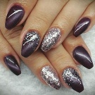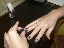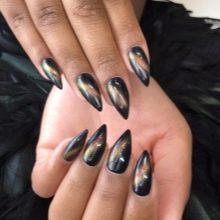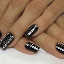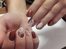 To emphasize the flickering of black, brown or plum manicure in the style in question, a golden mesh or small rhinestones on several fingers are usually used.