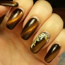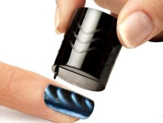 "Cat's Eye" gained popularity about ten years agowhen magnetic varnishes began to be used for nail design.Today, materials for such staining have undergone some improvements, so gel varnishes with a special composition remain relevant. Modern products are enriched with metal microparticles, which form a stunning resemblance to a gem on the coating. During the action of the magnet, the particles of the substance form an incredible effect on the nail plate, therefore, the varnishes sold today will achieve the desired result only when a special magnet is exposed.