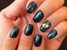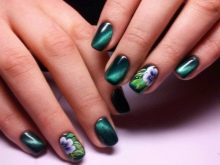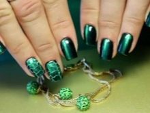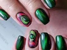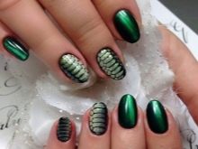 To make the “cat's eye” even more unique and attractive, you can decorate your fingers with shimmering varnish, imitating the skin of a reptile.The created 3D voluminous effect of the varnish is able to give the nails the maximum similarity with the original, which will be relevant during the creation of a single composition with a wardrobe, as well as for thematic events.