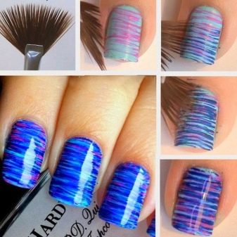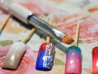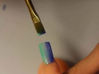 - A correctly selected brush will allow you to qualitatively design a neat decor with a gradient. For quick coating on the nail, it is better to choose a small and flat brush. To stir close colors, you can take a flat brush and a special fan-brush. If you need to create a geometric gradient, then you should worry about the presence of a stripper brush to apply thin strips with it.