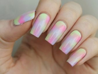 - In order for the selected color to be much brighter, and the result is the most stable and durable, it is necessary to apply a special base or any varnish available at the hands of pastel colors. With it, it will be possible to completely hide the nail plate under the gradient itself.