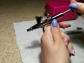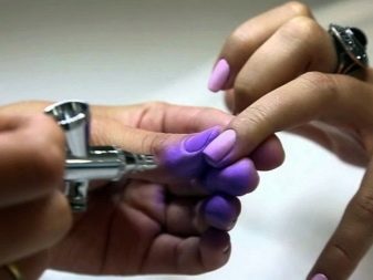 - The air gradient is also considered quite popular. They make it with the help of a special device called "airbrush", which during operation sprays the paint on the nail with a thin layer under serious air pressure. Most often, an airbrush is chosen for applying an ombre of a horizontal type. The device simply needs to be filled with the required amount of paint, a special compressor is connected to it, and the varnish begins to be applied with a thin layer on the desired part of the surface of the nail. Next, you just need to change the color and spray it on the tips of the nails so that a smoothly passing stretch of colors is visible.