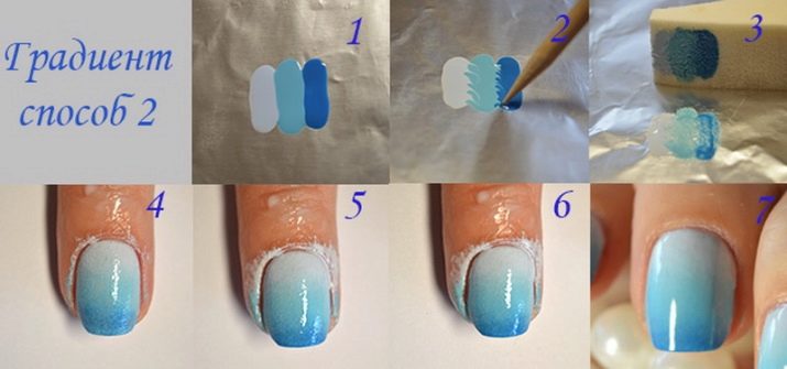 There are other methods for designing a gradient with an ordinary sponge - for example, the varnish is first spread on a special palette in the right order or according to the scheme, then you need to press the sponge to this surface and use it to transfer the varnish to the nails. In addition, with the sponge, you can determine the different direction of the gradient: make it vertically or horizontally, and also make it geometric.