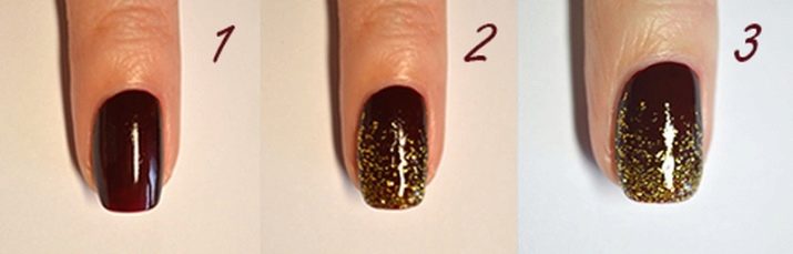 - A gradient with luxurious sparkles will look extremely unusual. Any available varnish is selected as the basis. As soon as the first layer of colored varnish dries, a coating layer with shiny particles must already be applied to it. For greater effect, glittering is best from the middle of the marigold to its edge. The design of the manicure is completed with a layer of protective coating.