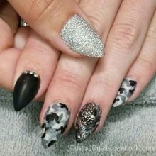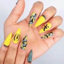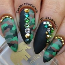 A military-style manicure is a new direction that confidently occupies a leading position in the world of haute couture. A girl with an unusual pattern on her nails will not only always look attractive and well-groomed, but will also become a mystery to surrounding men. A bold and frank nail design will emphasize the boldness, ease and sexuality of his mistress and in no case will look rude and aggressive.