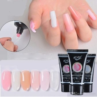 The main assistant in the artificial extension of the nail plate is camouflage gel, which is the basis for creating this manicure. The color scheme of the created base should be the same tone as the natural color of the nails. The most popular is a pale pink tone and light beige. The same colors of varnishes should be applied to natural nail plates.