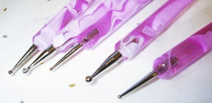 - Dots - a special tool, allowing to apply small blotches and wavy lines. This tool is necessary when creating a manicure with circles of different sizes. The size of the balls on the instrument, the master chooses, depending on the type of work performed. This tool can be purchased in specialized stores or made with your own hairpins. Experienced craftsmen sometimes use simple wooden toothpicks instead of dots.