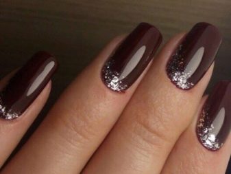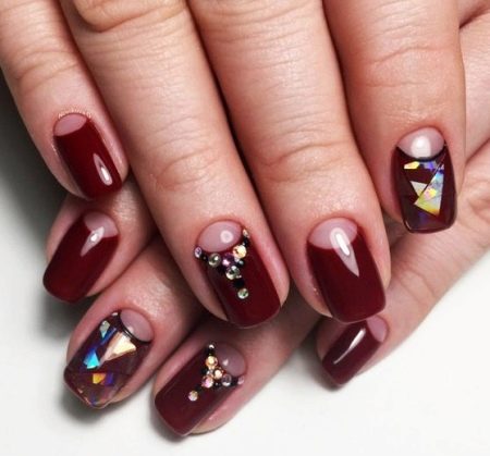- The lunar manicure in brown-cherry color with a transparent moon can be varied with rhinestones, forming an elongated figure on the ring fingers, and the effect of “broken glass” on the index fingers. Additionally, a narrow “smile” of black color is drawn on the latter between the main coating and the transparent lunula.