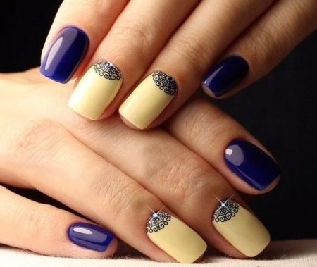 - Design in blue and yellow with lace lunula and rhinestones will suit middle-aged women. This design looks very respectable and elegant.