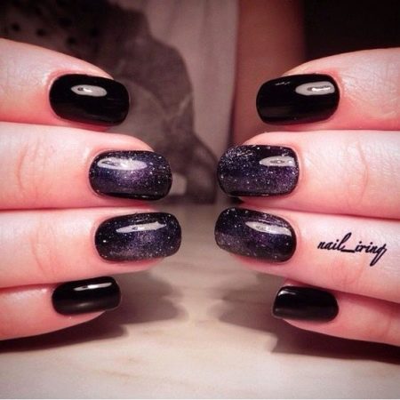 - Violet-black manicure with a shimmer looks unusual. Thanks to the application of the latter, something resembling a starry sky or outer space is recreated on the nails.