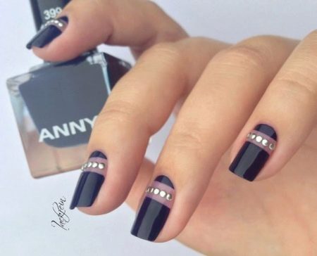 - Black gold. Despite the rather vivid combination, with the correct distribution of shades, the manicure will look very aristocratic and restrained. For example, the entire nail can be covered with black shellac, and in the center draw a narrow gold line. You can draw a golden varnish only the ring finger - it is enough to apply parallel gold strips (horizontal or diagonal) on the black coating and decorate them with medium-sized pebbles.