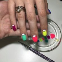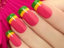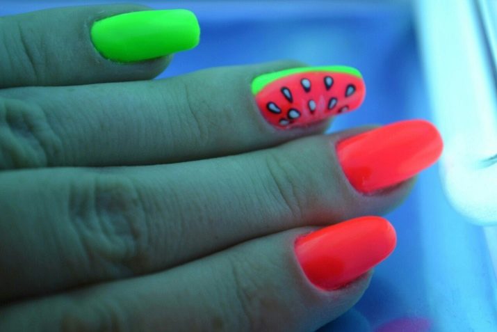 To create a stylish and chic nail design for the summer with a neon color, you need to be careful not to oversaturate the image with acid. For example, it can be a fruit on an accent nail (juicy kiwi, a slice of watermelon).