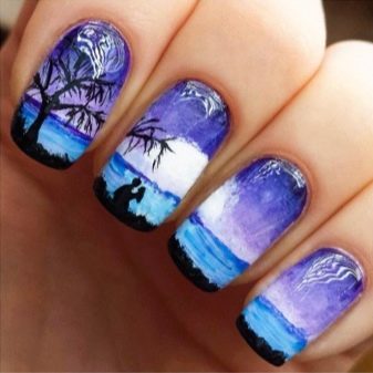 Summer plot compositions look great on nails. In this case, one image can be divided into 2-3 nails. However, on each of the nails, part of the image should not occupy more than half the area of the plate.