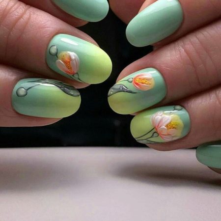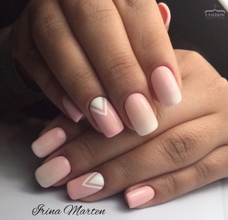 If you don’t like the ombre effect, you can supplement the bow with a manicure using the technique of a veil or “broken glass”. Both techniques are good for light palette tones. The nylon technique is unique in its translucent texture; it allows you to add lightness and airiness to the design. “Broken glass” is made on the basis of manicure film. For the summer, this is one of the best and trendy designs that allows you to add creativity and chic to the design.