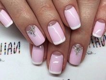Moon manicure can be decorated with rhinestones. This will be especially true for festive events (for example, for a wedding or New Year). Of course, it is not worth overloading the nails with additional elements, therefore it is enough to decorate with pebbles one or two nails. But if you want to shine, then rhinestones can be placed on each finger. The most successful area is the border of the hole in the nail growth zone. You can also decorate only one nail, then the manicure will look more restrained.