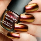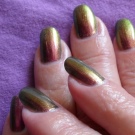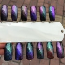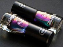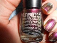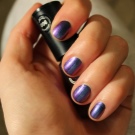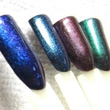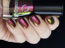The varnish of this brand is rather finely ground, due to which an almost mirror coating is obtained on the nails. The most saturated varnish looks on a black substrate and shimmers from purple to golden green, and it looks very beautiful.