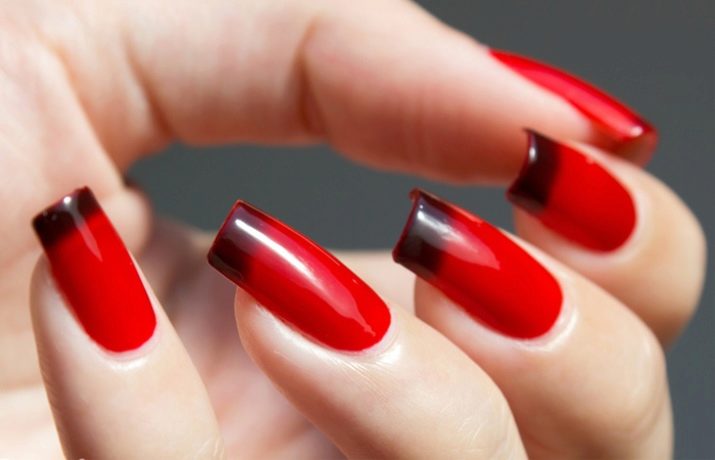 When choosing varnishes - and the chameleon is no exception here - red shades are very popular. In this example, an unusually beautiful combination of a maroon shade at the end of the nail and blood-red at its base is obtained.