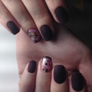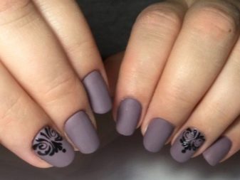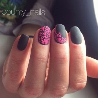 - With a glossy pattern. The theme of the combination of matte and glossy surfaces is continued by another popular decor, in which the nails are coated with a matte varnish and a glossy decor of darker tones is applied on top.
