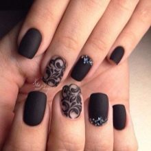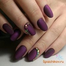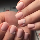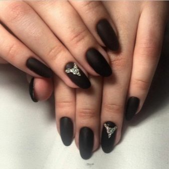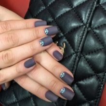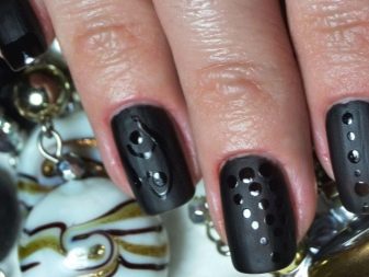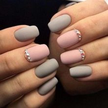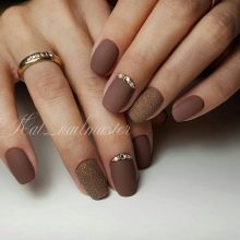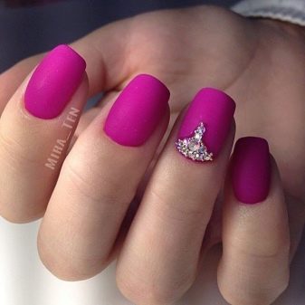 - With rhinestones or small beads. In this case, the matte shade is supplemented with small rhinestones, which create a truly luxurious effect. Usually they frame the nail hole or lay out a longitudinal strip in the center of the plate. If the decor uses larger beads, then you can attach them to the tip of the nail.