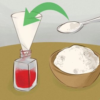 After this, it is necessary to open the bottle and insert a funnel into it, but so that it does not directly touch the varnish - in this case, the powder will begin to stick to the funnel instead of falling into the bubble.