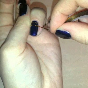 To make the pattern more diverse, you can use thin strips on an adhesive basis, which are attached to a nail painted with glossy varnish. After that, cover the entire plate directly on top of the strips with a matting compound, and after drying, immediately remove the strips.