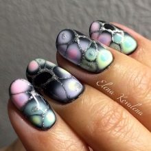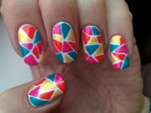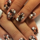 - Mosaic manicure with complex painting is also considered interesting. To increase the effectiveness of the patterns, the nail is completely covered with a special top, then, using a thin brush, they begin to draw rhombuses or squares. After drying the contour and lines, the formed cells are painted over with various shades. Such nail art is original and fills the image of a lady with a riddle and mystery. It is too bright for everyday life, but at the celebration it will not leave anyone indifferent, attracting the attention of others.