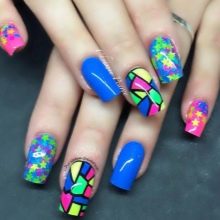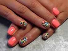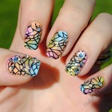 - A perfect example can be a manicure with a mosaic effect created using craquelure varnish. This coloring agent has a unique ability - after complete drying, its surface begins to crack, mosaic fragments form. In addition, in this design, you do not need to do additional drawing of details. This manicure is perfect for bright and self-confident girls.