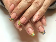 - Then, using acrylic paints or multi-colored varnish, they begin to apply abstraction from the side of the free edge of the marigold. The pattern should look like colored spots of different sizes and shapes. The combination and number of shades depends on the image and imagination of the girl, the main thing is that the “mosaic” should look harmonious. Between the background spots it is necessary to leave small gaps, which will later be filled with a contour.