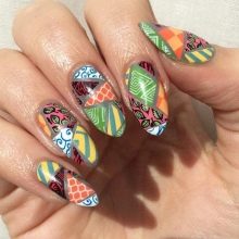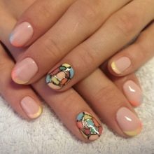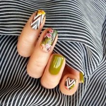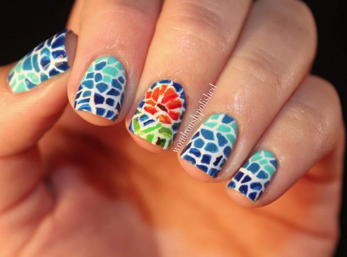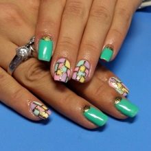 To avoid the effect of stickiness in a manicure, it is recommended to decorate only one or two fingers. In order to make a mosaic using casting, it is necessary to have a special material: sapphires, polymer, malachite and emerald. You can add extra shine to nail art with rhinestones, sparkles and stickers. For girls who attend an office, school or university, it is advisable to do manicures in soft colors, this will emphasize its officiality and severity. Interesting compositions for everyday look can be done with dots or stamping.