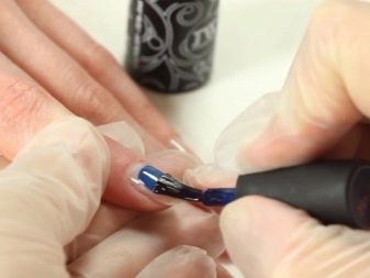 - At the end, the surface of the nails is dried and each detail of the pattern is outlined with a thin brush, needle or toothpick. The color and thickness of the contour layer may vary. Most often, stylists for eyeliner choose black, but any other contrasting shade is also good.