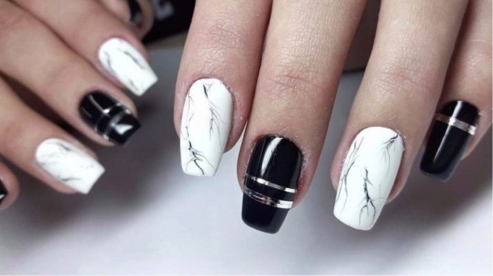 The combination of matte and glossy coatings is in great demand in nail art. The manicure acquires expressiveness and the texture of marble is beautifully emphasized in it. For maximum effect, it is necessary to draw patterns with gel polish, because it is convenient to use and allows you to slowly translate any design idea into reality. This design is well suited for nails of different lengths and shapes, so you will like both girls with a delicate and discreet image, and bright fashionistas.