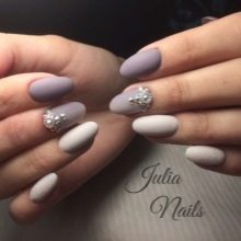 Professional varnishes, which give the effect of suede, can imitate velor or even rubber, are especially popular. They look especially impressive in black, gray and navy blue. The matte shade allows you to visually narrow the nail plate, so it is suitable for those who have it very wide. You can use a special matting agent that is easy to use and does not require special knowledge and skills. You can easily make such a manicure at home yourself, if you just hold the glossy varnish after application over hot steam.