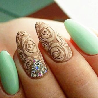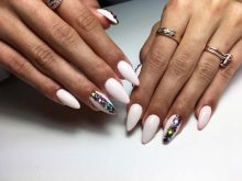 If you want to make the manicure elegant, then an interesting solution would be to use such auxiliary decorative elements as stones, rhinestones or sparkles. Shiny nails will be a good choice for a fashion party. Many brides prefer to do such a manicure for an important solemn event in their life. Gorgeous shining hands will be the subject of admiration of the opposite sex.