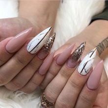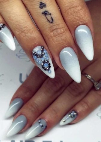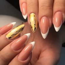 Smooth transitions always look elegant and non-trivial. The snow-white coating can smoothly flow into pink, mint, blue, cream. On sharp nails, this style looks sustained. Such nails will look delicate, and will suit any look.