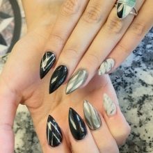 Nail plates of this form will be beautifully looked with the use of rubbing in different shades. You can make it on one finger or decorate everything at once. Brave ladies can use mirror options, they emphasize the originality and beauty of nails.