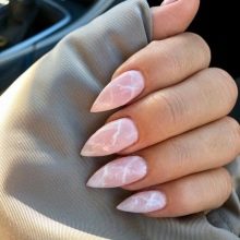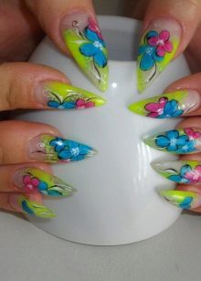 It is the sharp long nails that allow to realize an interesting three-dimensional effect. You can spread the world of flora and fauna with the help of different layers, depict frozen stones. It is only important to find a real professional who can implement such nails.