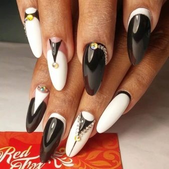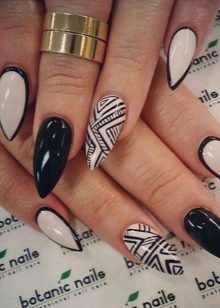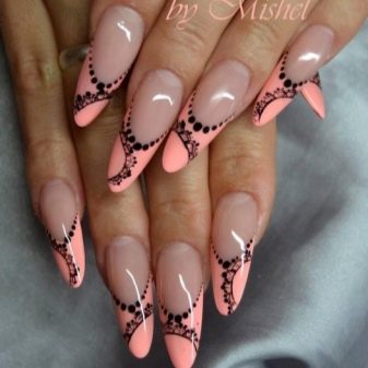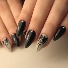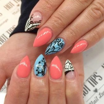 - Pointed fingers allow you to realize the most creative nail designs. Here you can fantasize, use different colors, textures, decor elements.