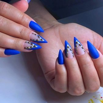 You can create attractive sharp nails with a matte finish. It is it that can give color saturation, emphasize the image. Here it is allowed to apply a plain varnish or an interesting design.