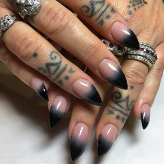 On the acute form of nails, it is quite possible to create an interesting horizontal gradient with various shades that will smoothly replace each other.