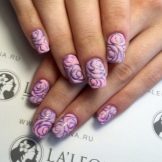 A special charm is given to the image of dew drops on flowers created using rhinestones. You can see plush floral arrangements. A white wedding sand manicure with flowers, magnificent patterns looks very nice.