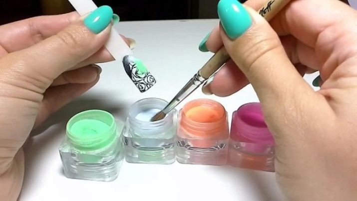 Often used acrylic powder, which in consistency is similar to velvet sand. With its help, you can create a more refined sand manicure. The print looks very neat, lasts longer than a drawing made of velvet sand.