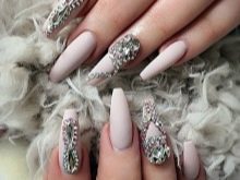 Stylists recommend lovers of rhinestones to look at the matte backgrounds. After all, it is a calm matte base that is able to balance the brightness of brilliant stones.