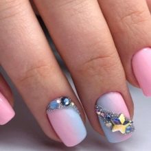 A delicate gradient of pink-blue colors as a background of accent nails perfectly emphasizes the luxury of the composition of rhinestones to match the foundation.
