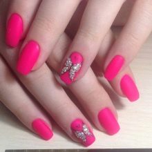 In everyday life, a matte manicure with a blue, gray, wine and berry background will look great. To highlight with stones one accent finger on the hand means to increase the degree of expressiveness, while avoiding absurdities. Incredibly good matte red in combination with rhinestones, but this option is better to save for the celebration.